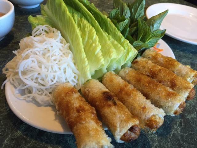 これが、私のベトナム料理人生でもっともおいしかった食べ物。パリッと香ばしくて、軽くて、レタスと臭い葉っぱと、茹でた米麺をスイートサワーソースにつけて食べる。