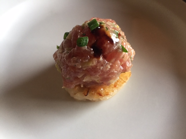こちらが、私の「今日イチ」です。リゾットケーキ、要するにリゾットにしたお米を焼いた上に、アヒのタルタルが載っている。リゾットケーキの香ばしさと、タルタルが絶妙!